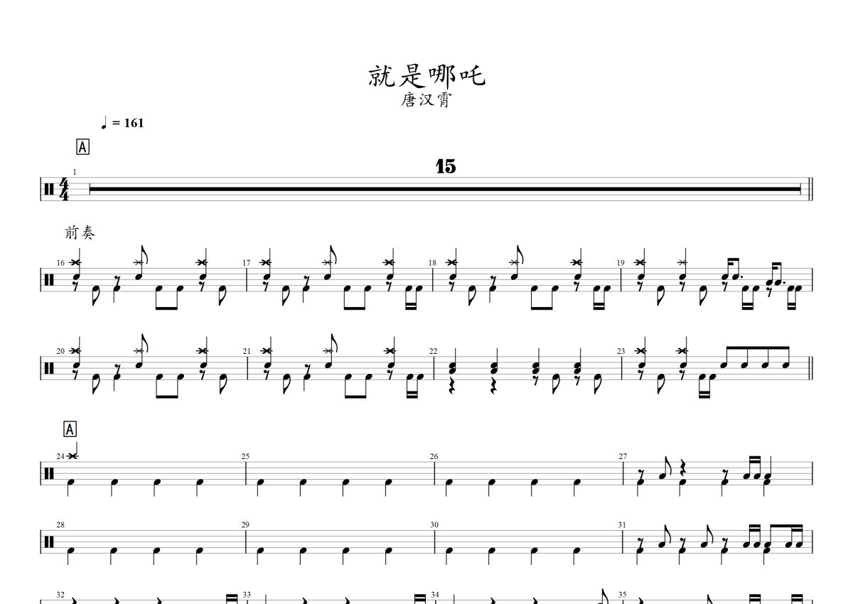 《就是哪吒》是唐汉霄演唱的一首歌曲,拍号为4/4拍,歌曲速度为每分钟161拍,这份架子鼓谱共有三张高清图谱,图谱由 @音符喷血者 编配上传,图谱使用五线谱编配,使用这份就是哪吒架子鼓谱,你将能够轻松地敲打出这首唐汉霄的就是哪吒,快来尝试吧。