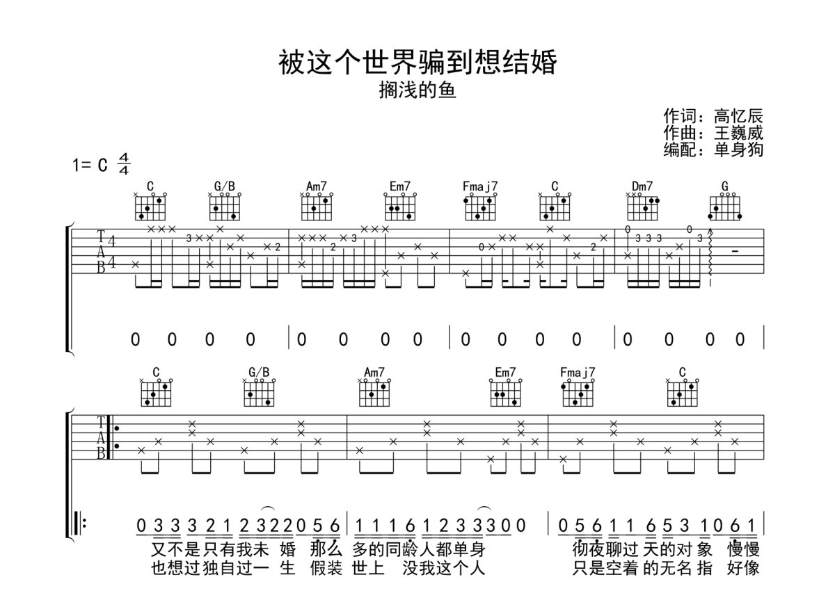 《被这个世界骗到想结婚》是搁浅的鱼演唱的一首歌曲,本吉他谱采用的是C调指法编配,这份吉他谱共有两张高清图谱,图谱由 @单身狗 编配上传,图谱使用六线谱编配,包含吉他和弦指法、简谱以及歌词部分,使用这份被这个世界骗到想结婚吉他谱,可以让你更加方便地掌握这首歌曲的弹唱技巧,快来尝试吧。搁浅的鱼《被这个世界骗到想结婚》吉他弹唱谱,采用C调指法编配,单身狗编配出品,共有2张高清图谱,免翻页排版设计。