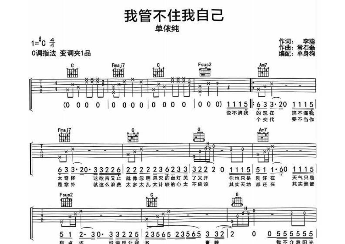 《我管不着我自己》是单依纯演唱的一首歌曲,拍号为4/4拍,歌曲原调为Db调,但由于原调指法比较难,为了方便弹奏,本吉他谱采用的是C调指法编配,变调夹1品弹奏即为原调,当然也可以根据自己的音域改变变调夹位置,或者通过改变和弦调性,以方便自己弹奏,这份吉他谱共有两张高清图谱,图谱由 @单身狗 编配上传,图谱使用六线谱编配,包含吉他和弦指法、简谱以及歌词部分,使用这份我管不着我自己吉他谱,可以让你更加方便地掌握这首歌曲的弹唱技巧,快来尝试吧。