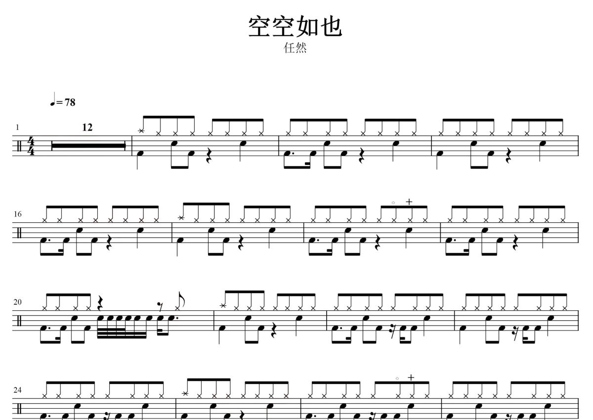 《空空如也》是胡66演唱的一首歌曲,拍号为4/4拍,歌曲速度为每分钟78拍,这份架子鼓谱共有两张高清图谱,图谱由 @音符喷血者 编配上传,图谱使用五线谱编配,使用这份空空如也架子鼓谱,你将能够轻松地敲打出这首胡66的空空如也,快来尝试吧。