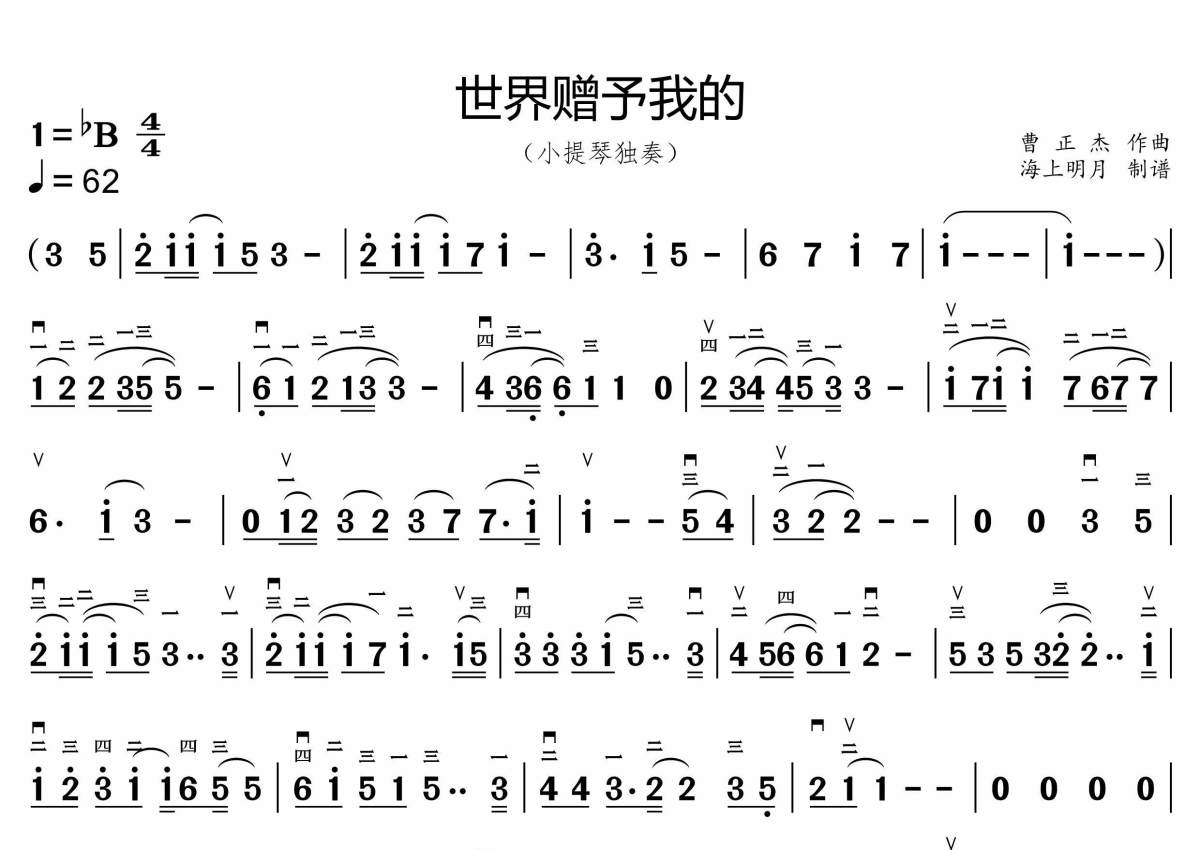 《世界赠予我的》是王菲演唱的一首歌曲,简谱版二,这份小提琴谱共有一张高清图谱,图谱由 @海上明月 编配上传小提琴简谱版本二,附件中的音频为伴奏。
