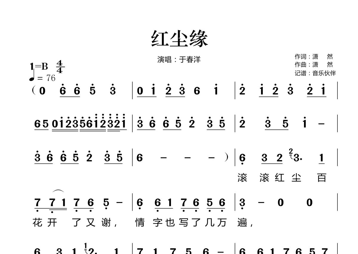 红尘缘简谱 - 于春洋演唱