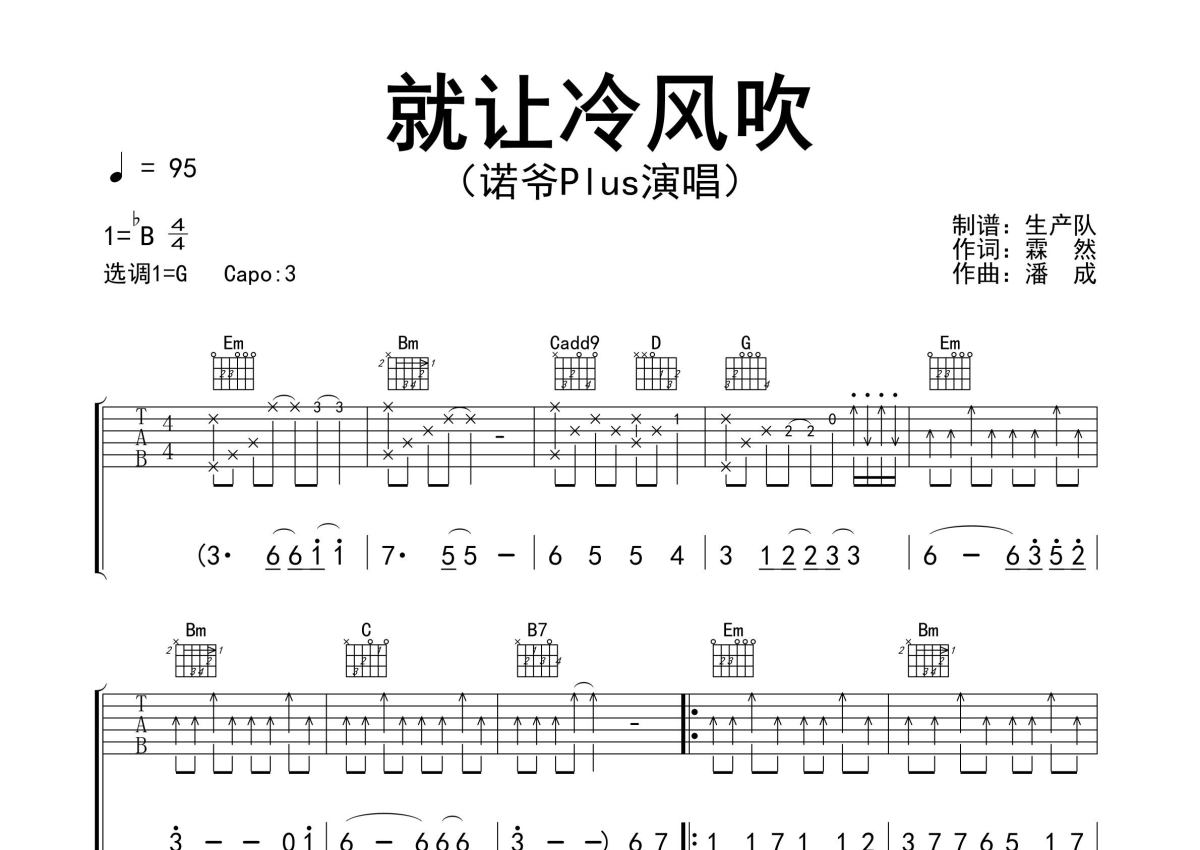 《就让冷风吹》是诺爷plus演唱的一首歌曲,精编完美版,拍号为4/4拍,歌曲速度为每分钟95拍,歌曲原调为Bb调,但由于原调指法比较难,为了方便弹奏,本吉他谱采用的是G调指法编配,变调夹3品弹奏即为原调,当然也可以根据自己的音域改变变调夹位置,或者通过改变和弦调性,以方便自己弹奏,这份吉他谱共有两张高清图谱,图谱由 @生产队 编配上传,图谱使用六线谱编配,包含吉他和弦指法、简谱以及歌词部分,使用这份就让冷风吹吉他谱,可以让你更加方便地掌握这首歌曲的弹唱技巧,快来尝试吧。诺爷Plus演唱的歌曲《就让冷风吹》原版吉他谱,精准的前奏、间奏solo编配,精编完美版,值得推荐!。
