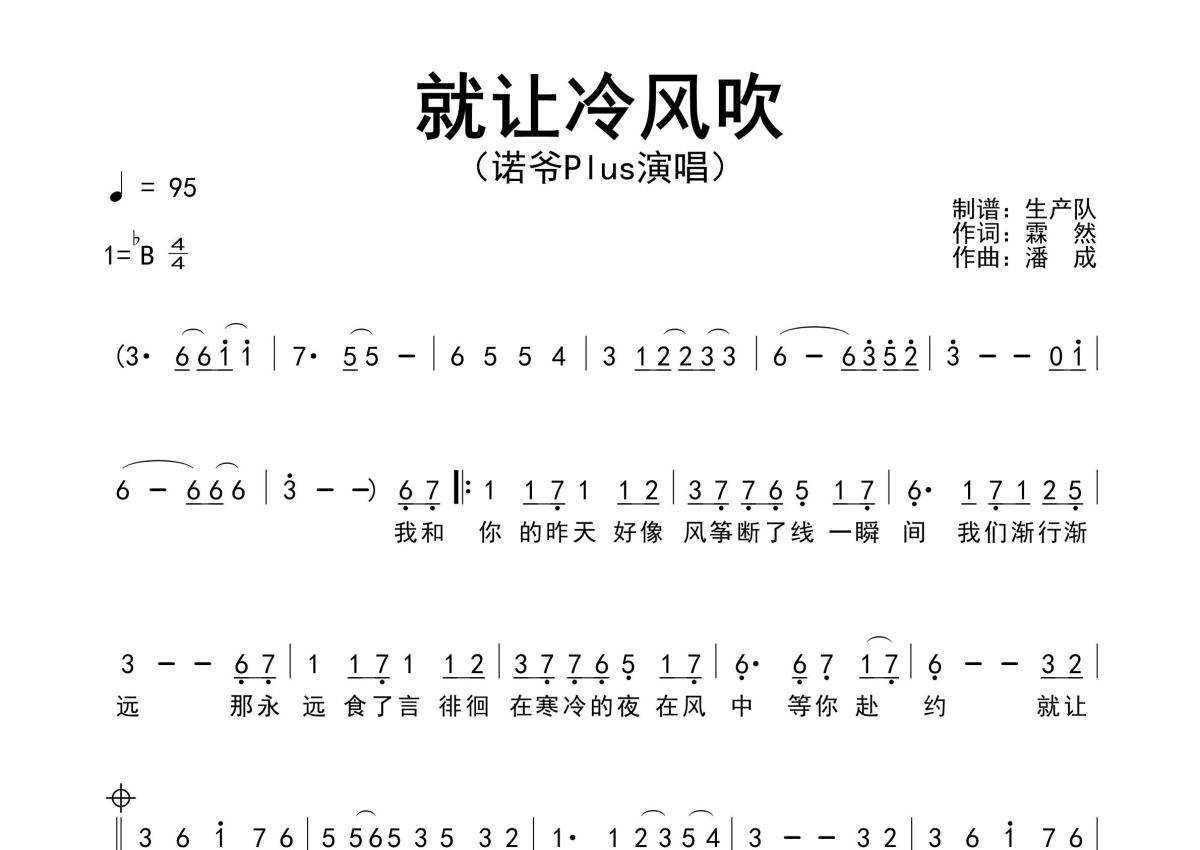 《就让冷风吹》是诺爷plus演唱的一首歌曲,原版简谱,拍号为4/4拍,歌曲速度为每分钟95拍,这份简谱共有一张高清图谱,图谱由 @生产队 编配上传诺爷Plus演唱的歌曲《就让冷风吹》原版简谱,精准的前奏、间奏solo编配。