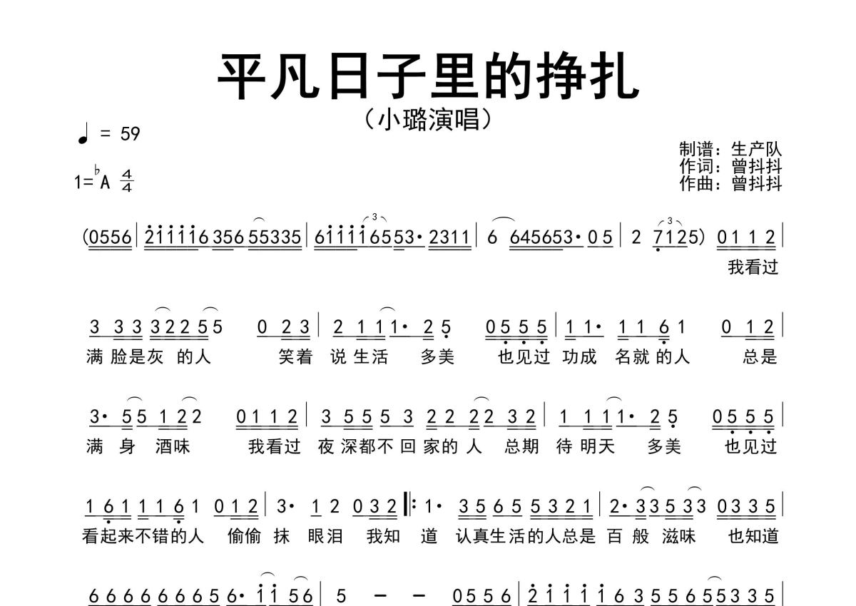 《平凡日子里的挣扎》是小璐演唱的一首歌曲,原版简谱,拍号为4/4拍,歌曲速度为每分钟59拍,这份简谱共有一张高清图谱,图谱由 @生产队 编配上传小璐演唱的歌曲《平凡日子里的挣扎》原版简谱,精准的前奏、间奏、尾奏solo编配。