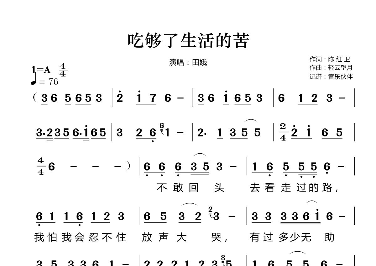 《吃够了生活的苦》是田娥演唱的一首歌曲,这份简谱共有两张高清图谱,图谱由 @音乐伙伴 编配上传。