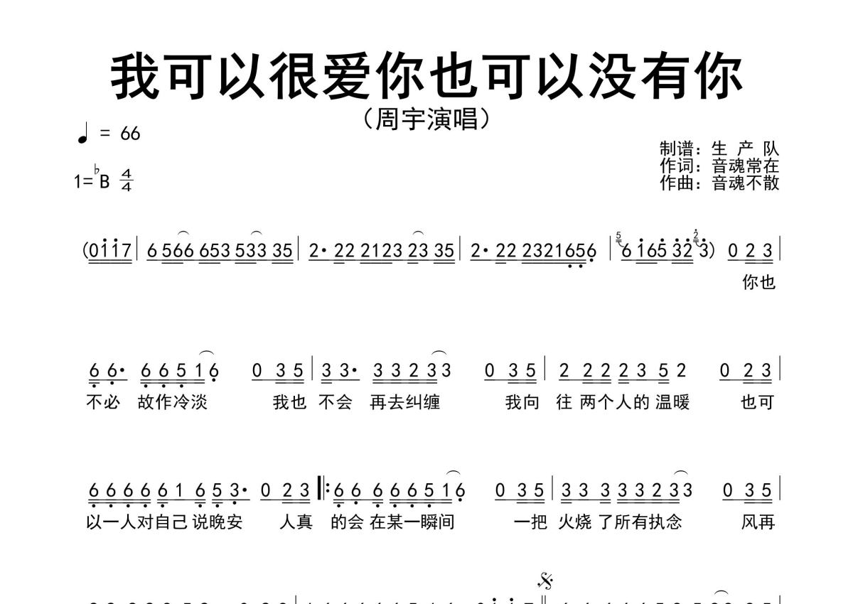 《我可以很爱你也可以没有你》是周宇演唱的一首歌曲,原版简谱,拍号为4/4拍,歌曲速度为每分钟66拍,这份简谱共有一张高清图谱,图谱由 @生产队 编配上传周宇演唱的歌曲《我可以很爱你也可以没有你》原版简谱,完整的前奏、间奏solo编配。