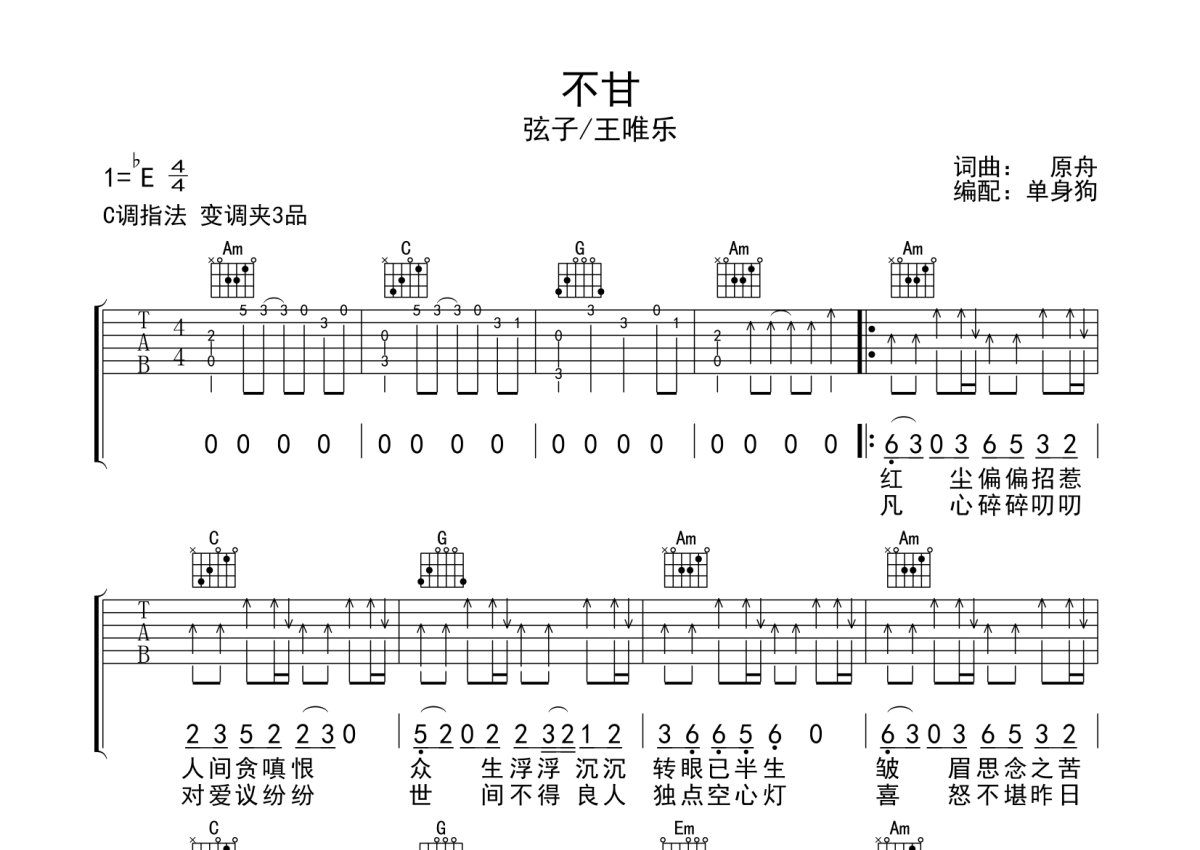 弦子/王唯乐《不甘》吉他谱 - C调弹唱六线谱