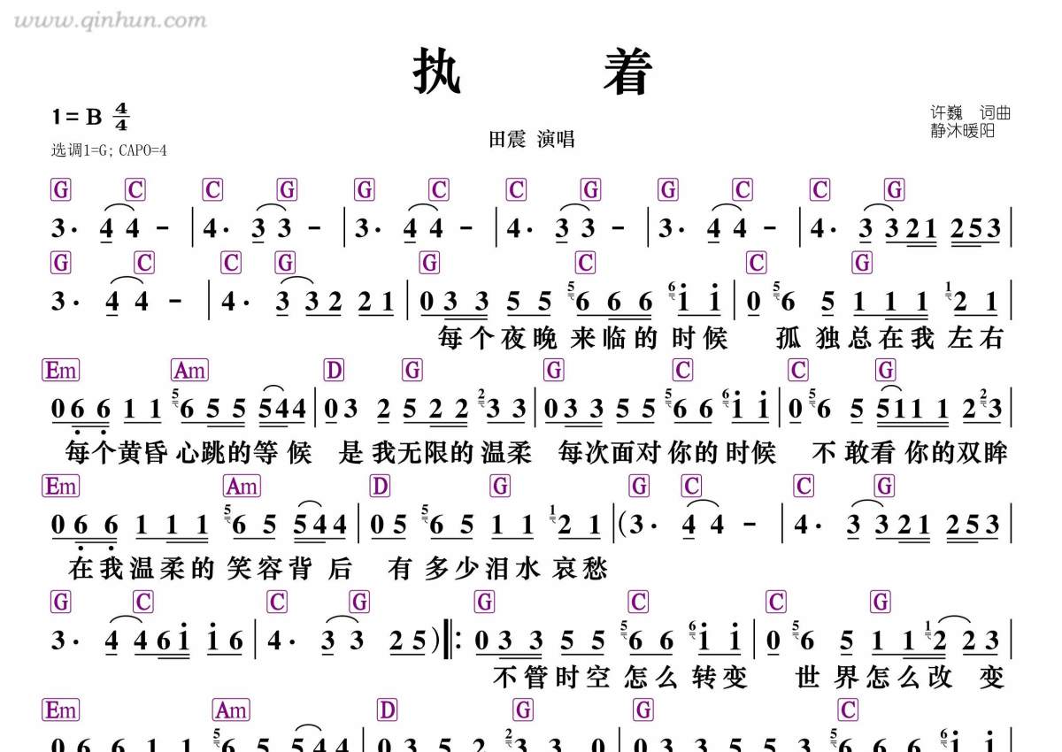 《执着》是田震演唱的一首歌曲,和弦谱,拍号为4/4拍,这份简谱共有一张高清图谱,图谱由 @静沐暖阳 编配上传。