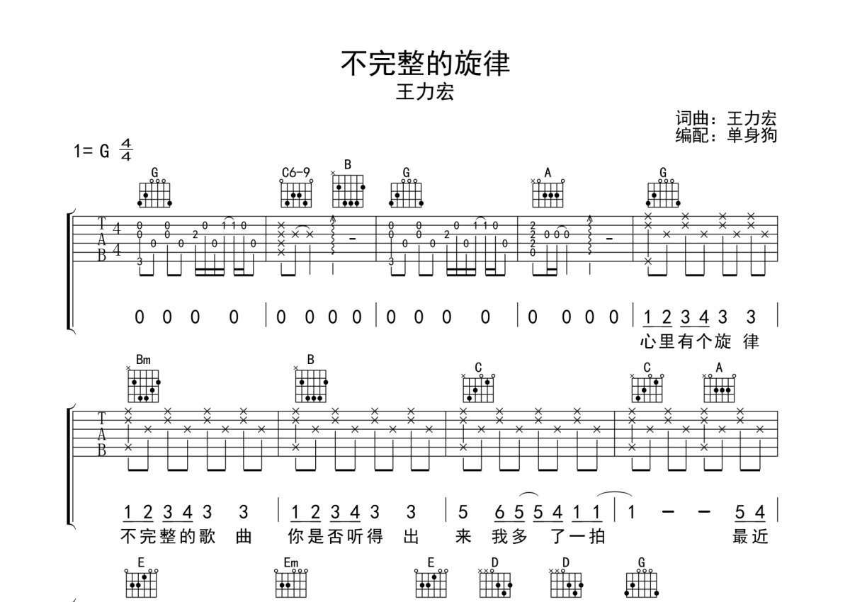 王力宏《不完整的旋律》吉他谱 - G调弹唱六线谱