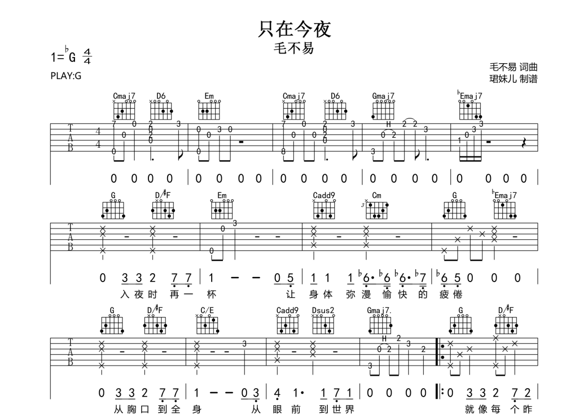 毛不易《只在今夜》吉他谱 - G调弹唱六线谱