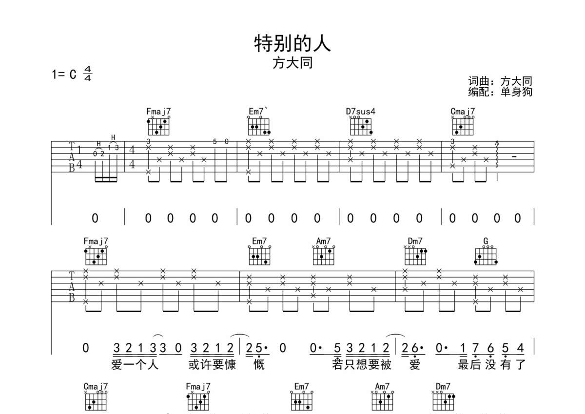 方大同《特别的人》吉他谱 - C调弹唱六线谱