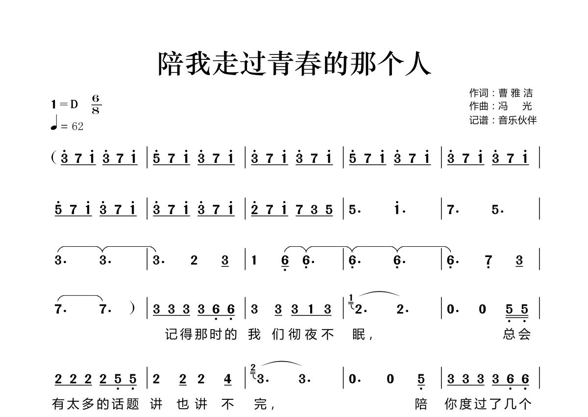 《陪我走过青春的那个人》是大欢演唱的一首歌曲,拍号为6/8拍,歌曲速度为每分钟62拍,这份简谱共有两张高清图谱,图谱由 @音乐伙伴 编配上传。
