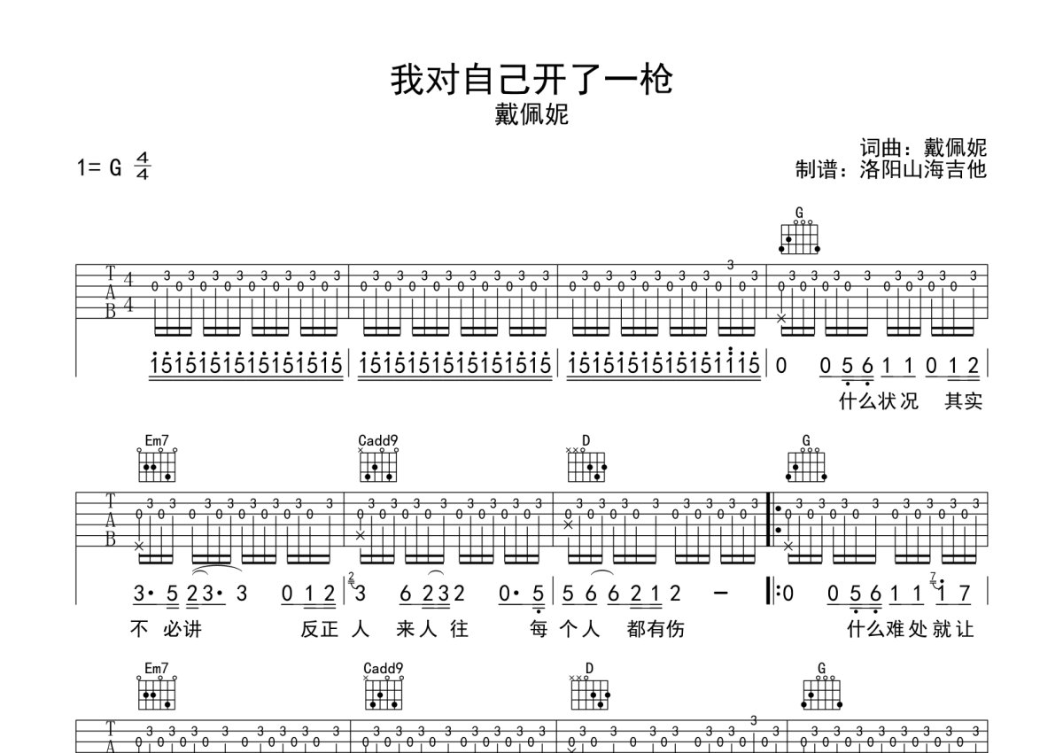 《我对自己开了一枪》是佛跳墙演唱的一首歌曲,本吉他谱采用的是G调指法编配,这份吉他谱共有两张高清图谱,图谱由 @何奔洋 编配上传,图谱使用六线谱编配,包含吉他和弦指法、简谱以及歌词部分,曲谱配备了相关的音频提供试听,使用这份我对自己开了一枪吉他谱,可以让你更加方便地掌握这首歌曲的弹唱技巧,快来尝试吧。