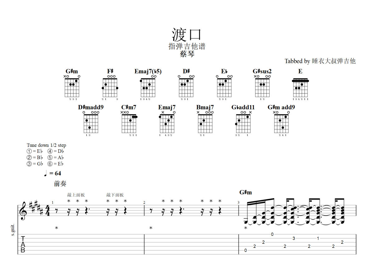 《渡口》是蔡琴演唱的一首歌曲,指弹吉他,这份吉他谱共有四张高清图谱,图谱由 @睡衣大叔弹吉他 编配上传,图谱使用六线谱编配,曲谱配备了相关的音频提供试听,使用这份渡口吉他谱,可以让你更加方便地掌握这首歌曲的演奏技巧,快来尝试吧。