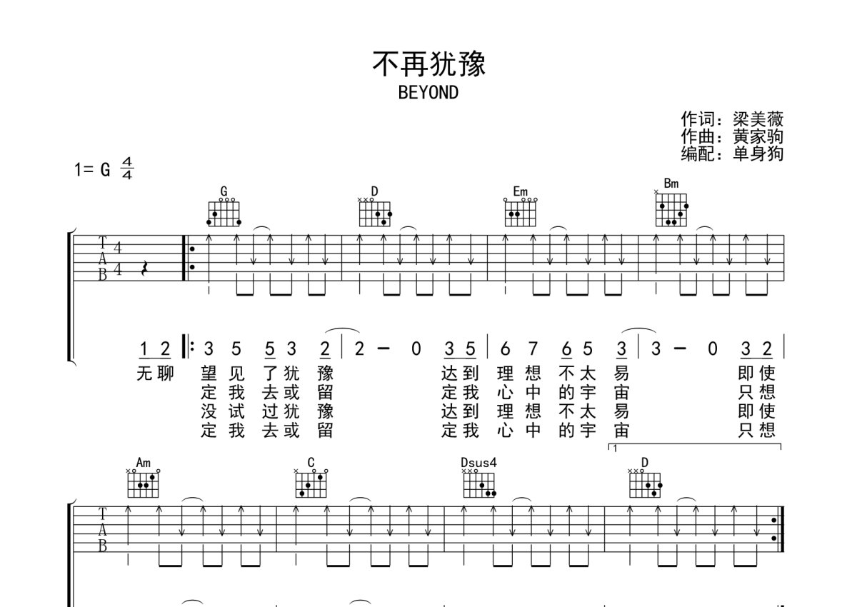《不再犹豫》是Beyond演唱的一首歌曲,本吉他谱采用的是G调指法编配,这份吉他谱共有三张高清图谱,图谱由 @单身狗 编配上传,图谱使用六线谱编配,包含吉他和弦指法、简谱以及歌词部分,使用这份不再犹豫吉他谱,可以让你更加方便地掌握这首歌曲的弹唱技巧,快来尝试吧。Beyond《不再犹豫》吉他弹唱谱,采用G调指法编配,单身狗编配出品,共有3张高清图谱。