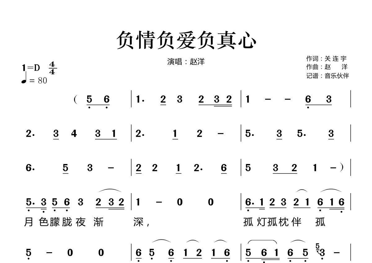 《负情负爱负真心》是赵洋演唱的一首歌曲,拍号为4/4拍,歌曲速度为每分钟80拍,这份简谱共有两张高清图谱,图谱由 @音乐伙伴 编配上传。