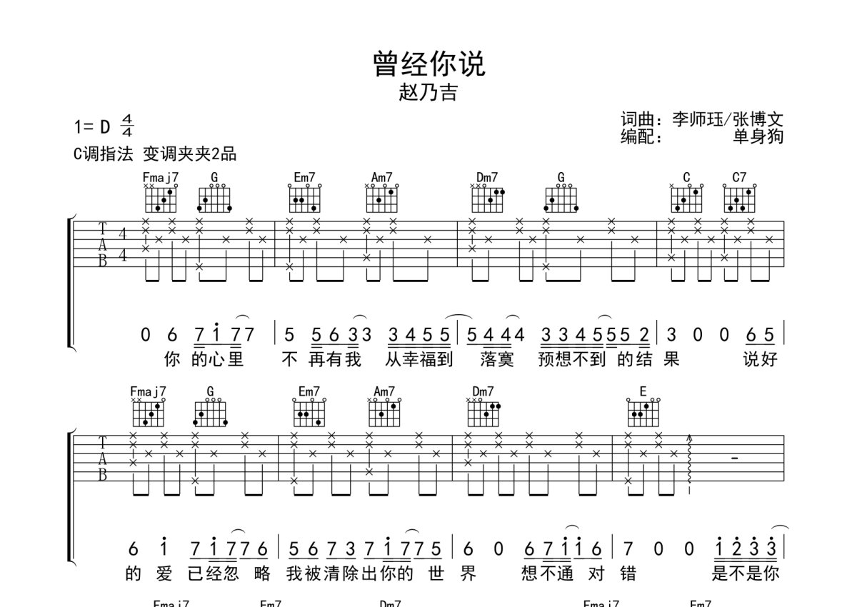 《曾经你说》是赵乃吉演唱的一首歌曲,本吉他谱采用的是C调指法编配,这份吉他谱共有三张高清图谱,图谱由 @单身狗 编配上传,图谱使用六线谱编配,包含吉他和弦指法、简谱以及歌词部分,使用这份曾经你说吉他谱,可以让你更加方便地掌握这首歌曲的弹唱技巧,快来尝试吧。赵乃吉《曾经你说》吉他弹唱谱,采用C调指法编配,单身狗编配出品,共有3张高清图谱。