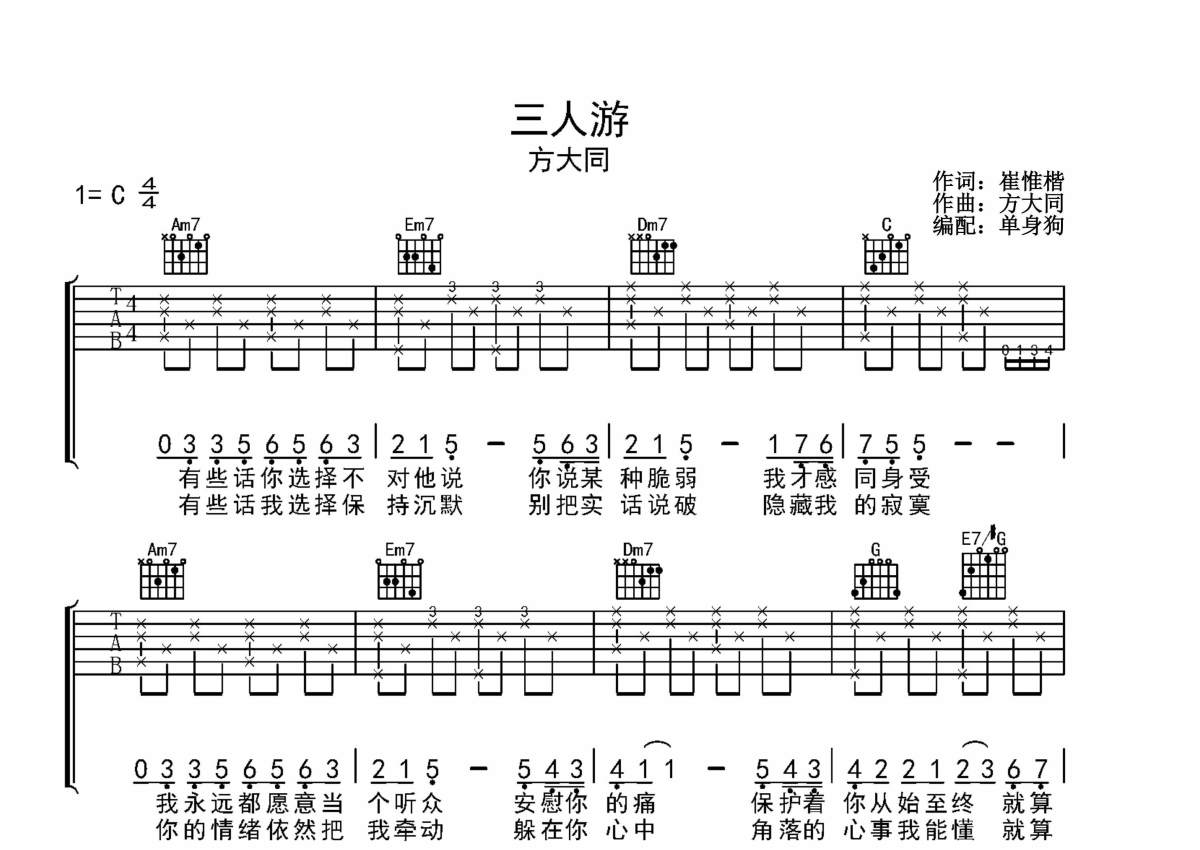 《三人游》是方大同演唱的一首歌曲,拍号为4/4拍,歌曲原调为C调,本吉他谱采用的是C调指法编配,演奏时不需要使用变调夹即为原调,这份吉他谱共有三张高清图谱,图谱由 @单身狗 编配上传,图谱使用六线谱编配,包含吉他和弦指法、简谱以及歌词部分,使用这份三人游吉他谱,可以让你更加方便地掌握这首歌曲的弹唱技巧,快来尝试吧。