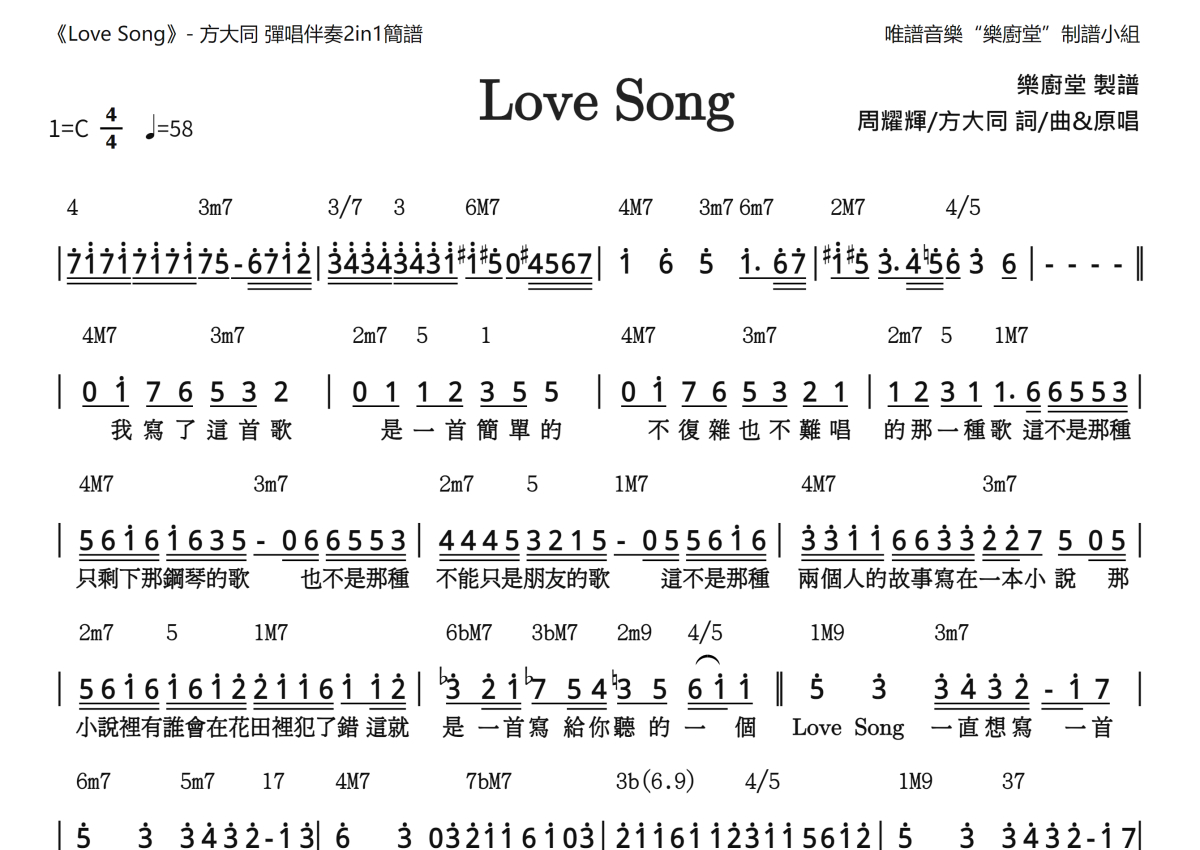《love song》是方大同演唱的一首歌曲,和弦简谱,这份简谱共有两张高清图谱,图谱由 @唯谱音乐"乐厨堂"发布小组 编配上传。
