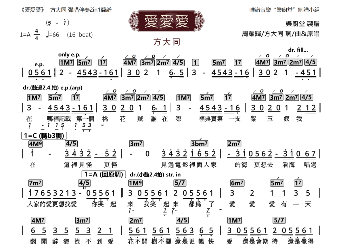 “乐厨堂”乐谱发布小组: 出版级乐谱扒谱制谱——以职业乐手圈通行标准记谱,遵循原版和声、伴奏元素和段落结构。 ❶ 2.0多功能专业团谱:采用台湾卓著公司开创的二代简谱标准制作。二代简谱无疑是迄今为止最科学、最易读的专业范畴多功能记谱方案:❷ 框架谱:采用职业乐手通常记谱方案制作。