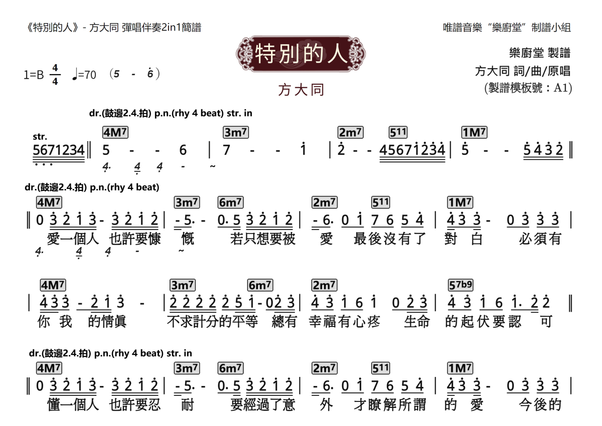 “乐厨堂”乐谱发布小组: 出版级乐谱扒谱制谱——以职业乐手圈通行标准记谱,遵循原版和声、伴奏元素和段落结构。 ❶ 2.0多功能专业团谱:采用台湾卓著公司开创的二代简谱标准制作。二代简谱无疑是迄今为止最科学、最易读的专业范畴多功能记谱方案:❷ 框架谱:采用职业乐手通常记谱方案制作。