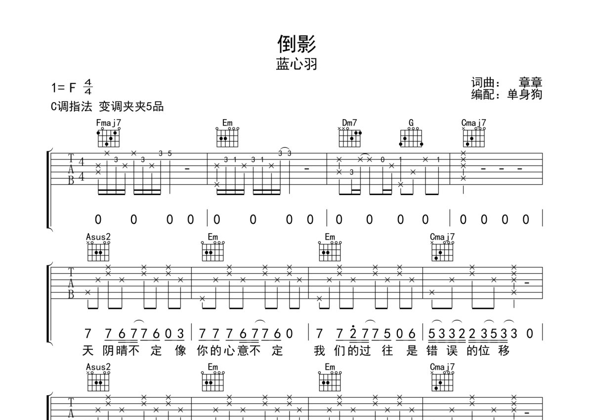 蓝心羽《倒影》吉他谱 - C调弹唱六线谱