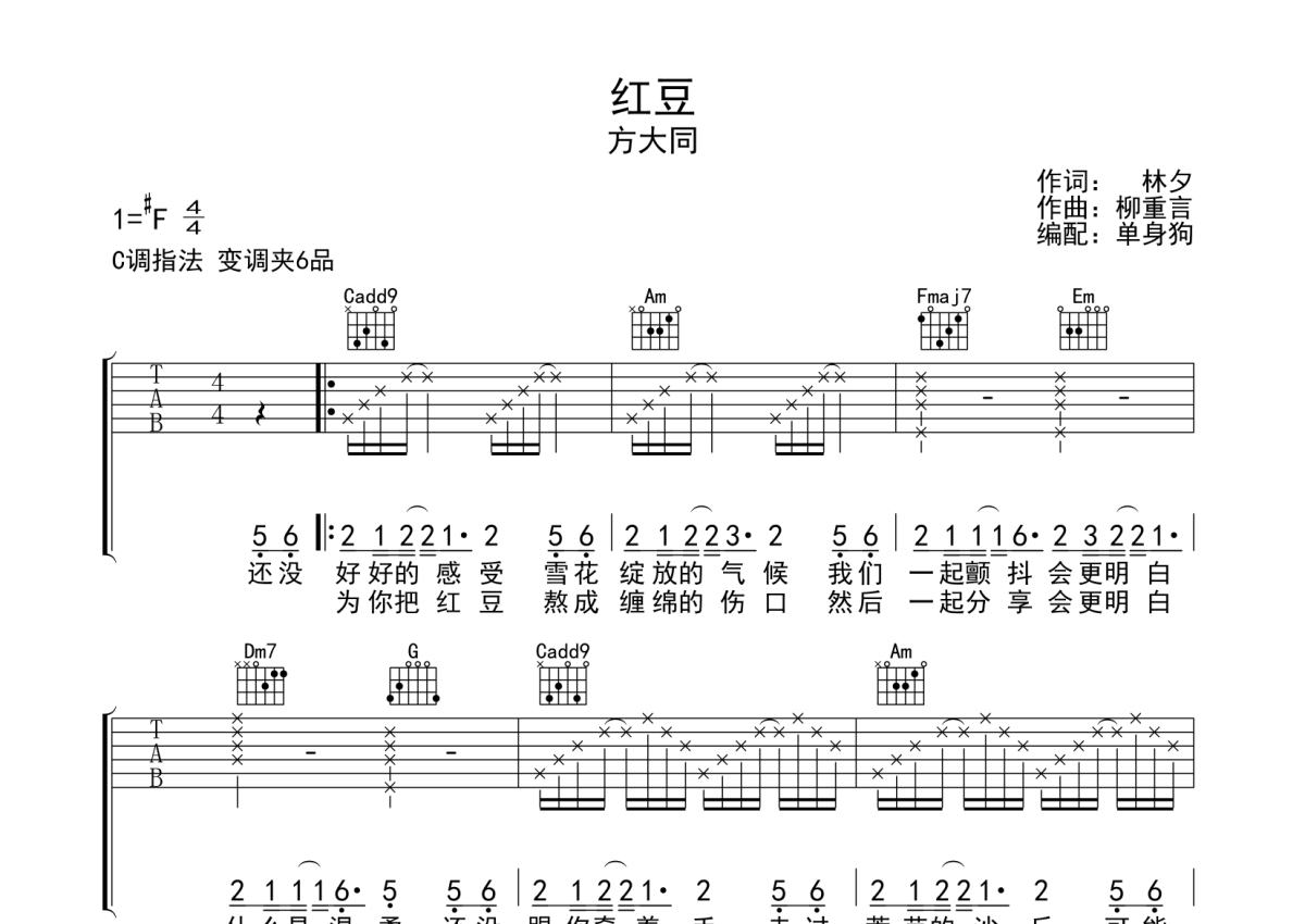 《红豆》是方大同演唱的一首歌曲,拍号为4/4拍,歌曲原调为Gb调,但由于原调指法比较难,为了方便弹奏,本吉他谱采用的是C调指法编配,变调夹6品弹奏即为原调,当然也可以根据自己的音域改变变调夹位置,或者通过改变和弦调性,以方便自己弹奏,这份吉他谱共有两张高清图谱,图谱由 @单身狗 编配上传,图谱使用六线谱编配,包含吉他和弦指法、简谱以及歌词部分,使用这份红豆吉他谱,可以让你更加方便地掌握这首歌曲的弹唱技巧,快来尝试吧。