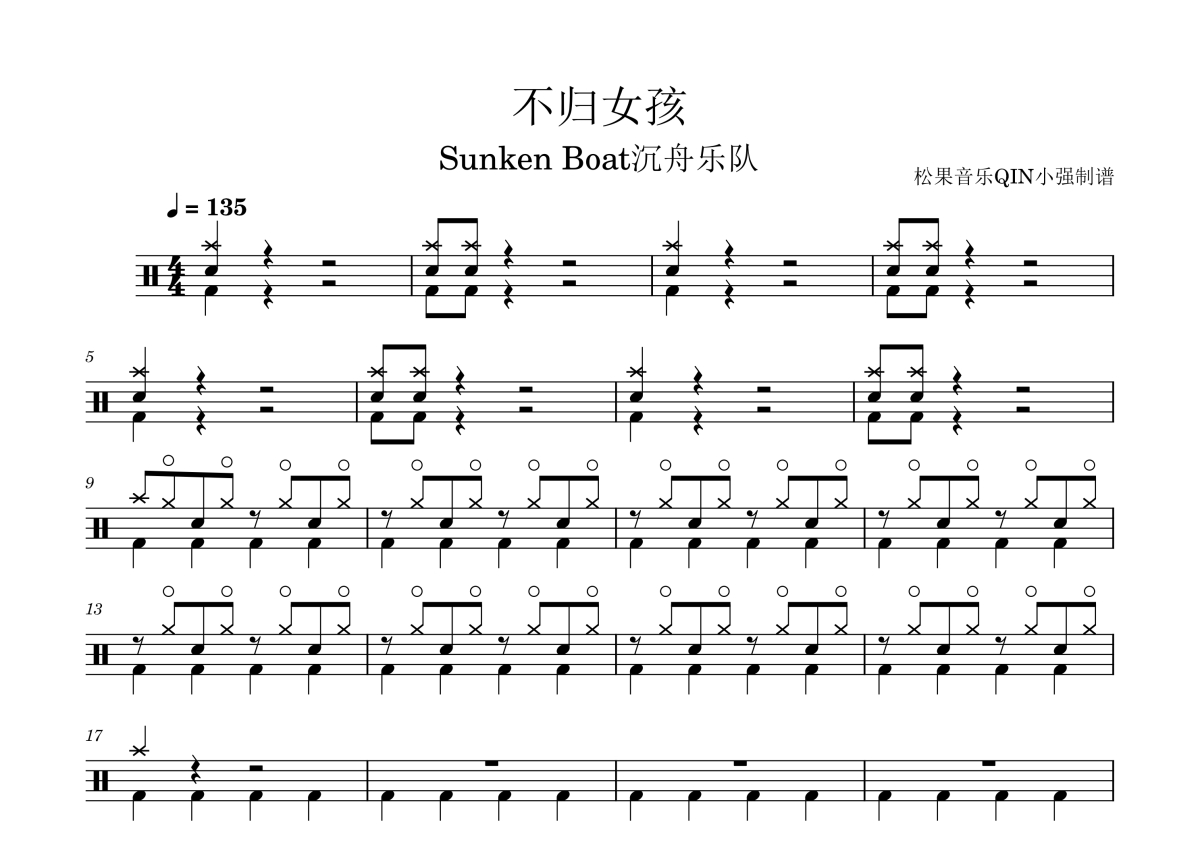 《不归女孩》是Sunken Boat 沉舟乐队演唱的一首歌曲,拍号为4/4拍,这份架子鼓谱共有三张高清图谱,图谱由 @松果音乐QIN小强 编配上传,图谱使用五线谱编配,使用这份不归女孩架子鼓谱,你将能够轻松地敲打出这首Sunken Boat 沉舟乐队的不归女孩,快来尝试吧。《不归女孩》沉舟乐队的音乐风格具有浓郁的摇滚色彩,同时又融入了电子音乐的元素。他们结合各种乐器,不断尝试创新,将这两种风格完美融合在一起,创造出了独具特色的音乐风格。在他们的音乐作品中,能够感受到强烈的情感冲击力和丰富的音乐层次。