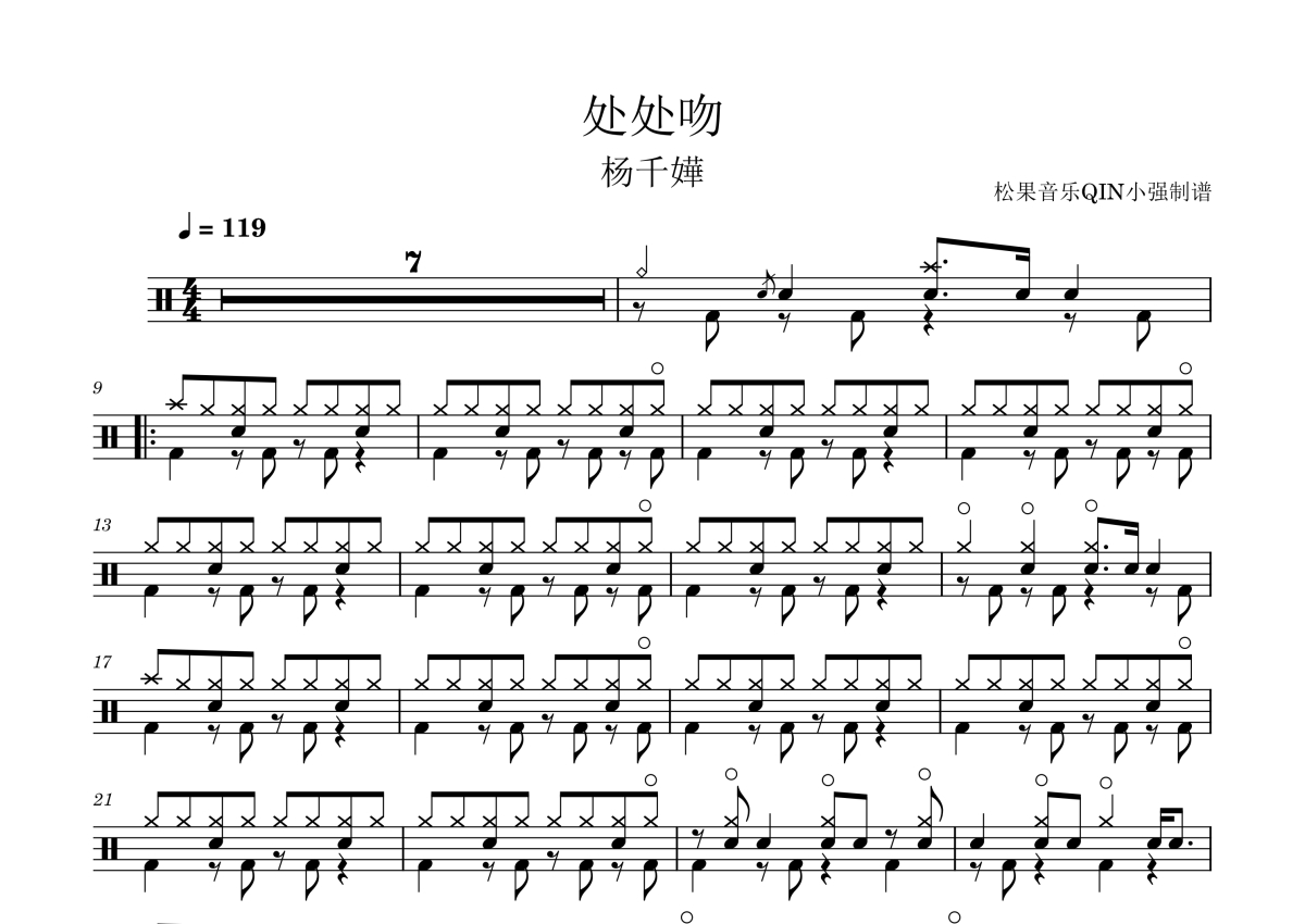《处处吻》是杨千嬅演唱的一首歌曲,拍号为4/4拍,这份架子鼓谱共有两张高清图谱,图谱由 @松果音乐QIN小强 编配上传,图谱使用五线谱编配,使用这份处处吻架子鼓谱,你将能够轻松地敲打出这首杨千嬅的处处吻,快来尝试吧。《处处吻》是杨千嬅演唱的粤语歌曲,由林夕作词,雷颂德作曲,收录于杨千嬅2004年发行的音乐专辑《电光幻影》。