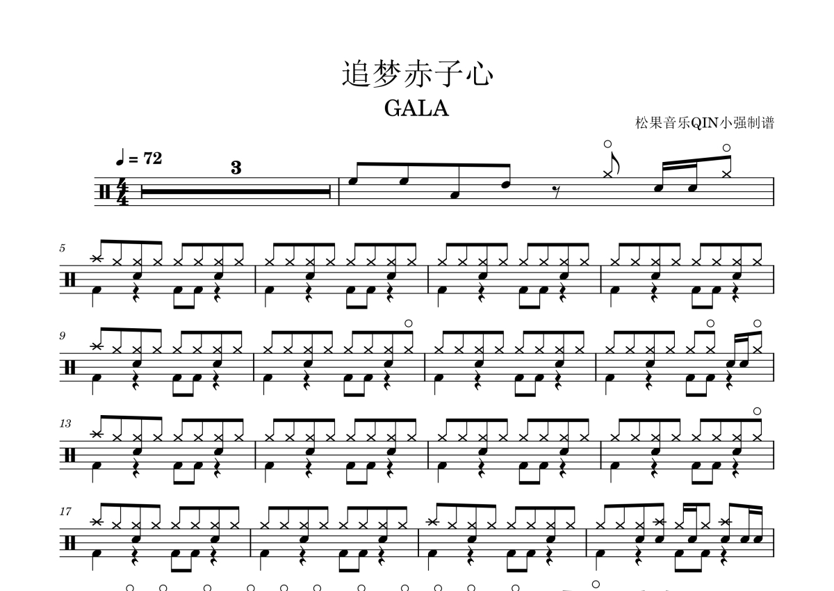 《追梦赤子心》是GALA乐队演唱的一首歌曲,这份架子鼓谱共有两张高清图谱,图谱由 @松果音乐QIN小强 编配上传,图谱使用五线谱编配,使用这份追梦赤子心架子鼓谱,你将能够轻松地敲打出这首GALA乐队的追梦赤子心,快来尝试吧。《追梦赤子心》是由苏朵作词和谱曲,甘虎编曲,GALA乐队演唱的歌曲,收录于2011年3月24日发行的专辑《追梦痴子心》中 。该曲也是2015年播出的动画《那年那兔那些事儿》的片尾曲、2017年播出的电影《空天猎》的片尾曲和2021年播出的电视剧《理想之城》的片头曲。