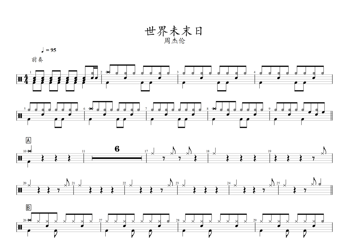 《世界未末日》是周杰伦演唱的一首歌曲,拍号为4/4拍,歌曲速度为每分钟95拍,这份架子鼓谱共有两张高清图谱,图谱由 @音符喷血者 编配上传,图谱使用五线谱编配,使用这份世界未末日架子鼓谱,你将能够轻松地敲打出这首周杰伦的世界未末日,快来尝试吧。