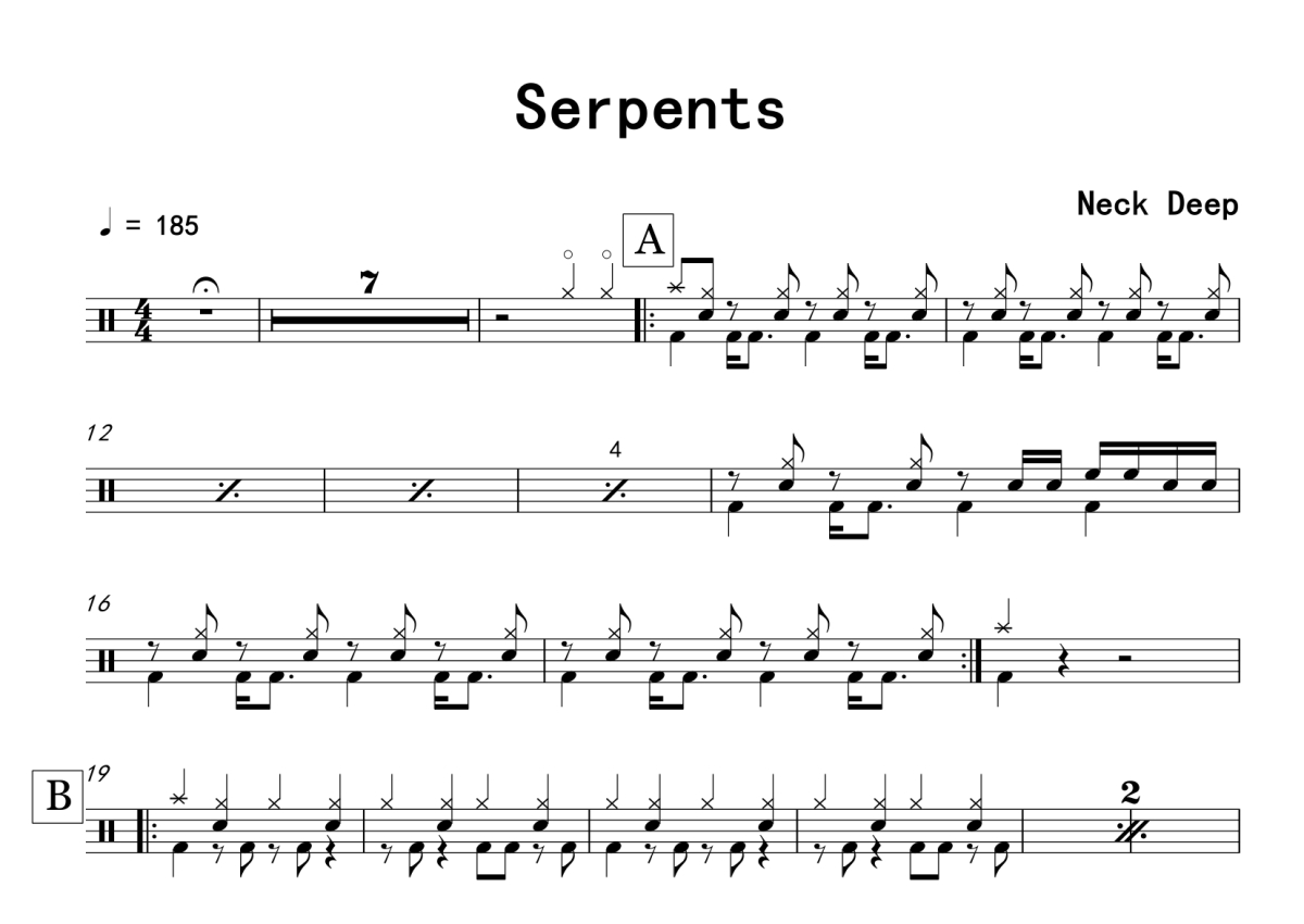 《Serpents》是Neck Deep演唱的一首歌曲,拍号为4/4拍,歌曲速度为每分钟185拍,这份架子鼓谱共有两张高清图谱,图谱由 @音符喷血者 编配上传,图谱使用五线谱编配,使用这份Serpents架子鼓谱,你将能够轻松地敲打出这首Neck Deep的Serpents,快来尝试吧。