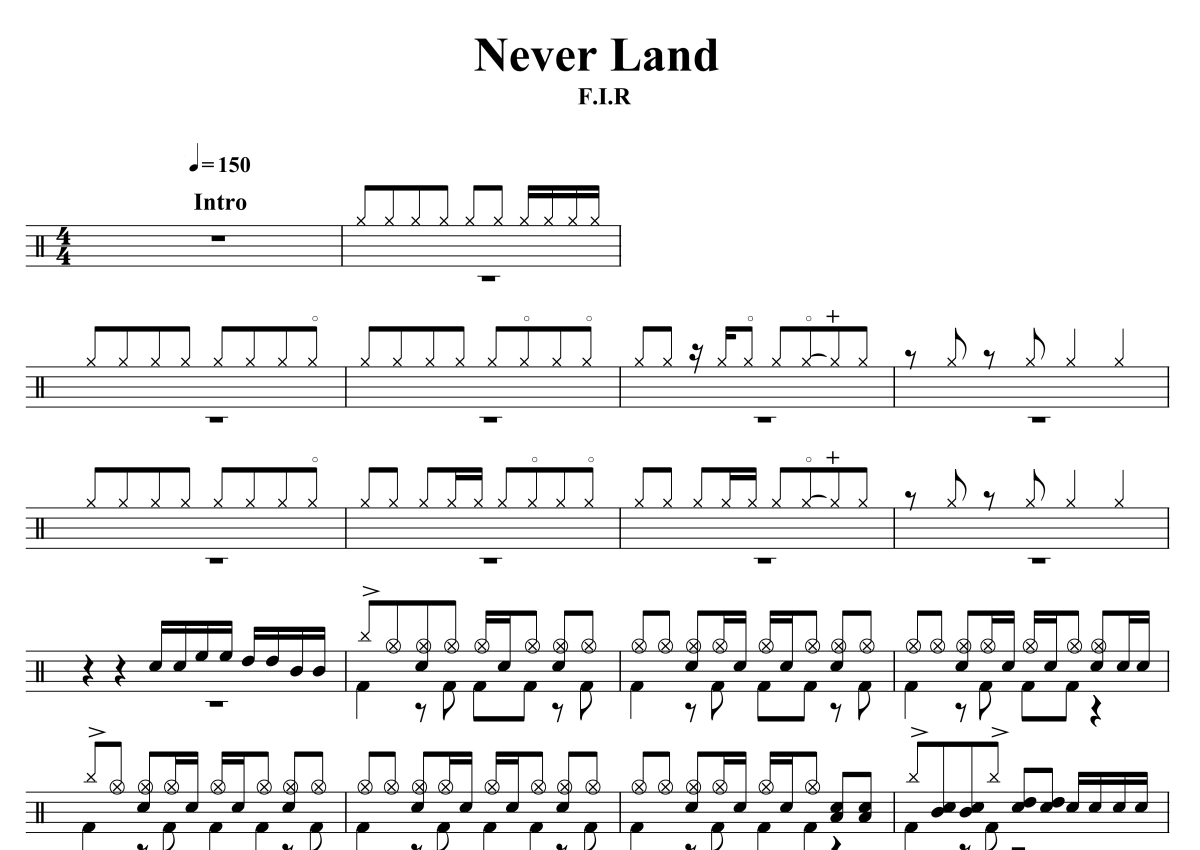 《Never land》是飞儿乐团演唱的一首歌曲,拍号为4/4拍,歌曲速度为每分钟150拍,这份架子鼓谱共有三张高清图谱,图谱由 @音符喷血者 编配上传,图谱使用五线谱编配,使用这份Never land架子鼓谱,你将能够轻松地敲打出这首飞儿乐团的Never land,快来尝试吧。