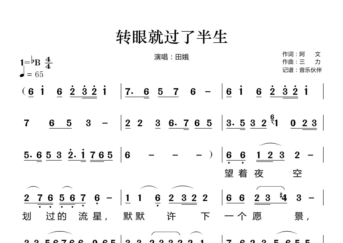 转眼就过了半生简谱 - 田娥演唱