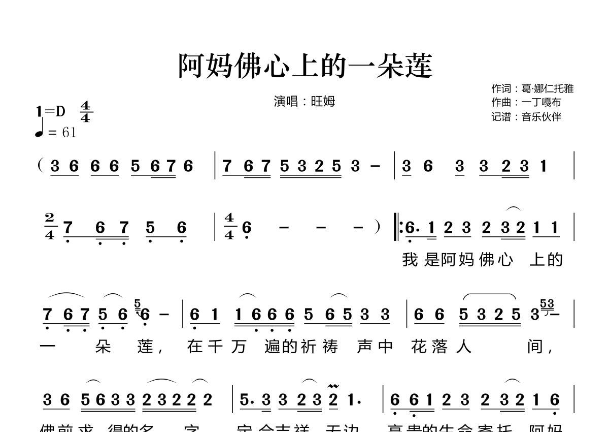 《阿妈佛心上的一朵莲》是旺姆演唱的一首歌曲,拍号为4/4拍,歌曲速度为每分钟61拍,这份简谱共有两张高清图谱,图谱由 @音乐伙伴 编配上传。