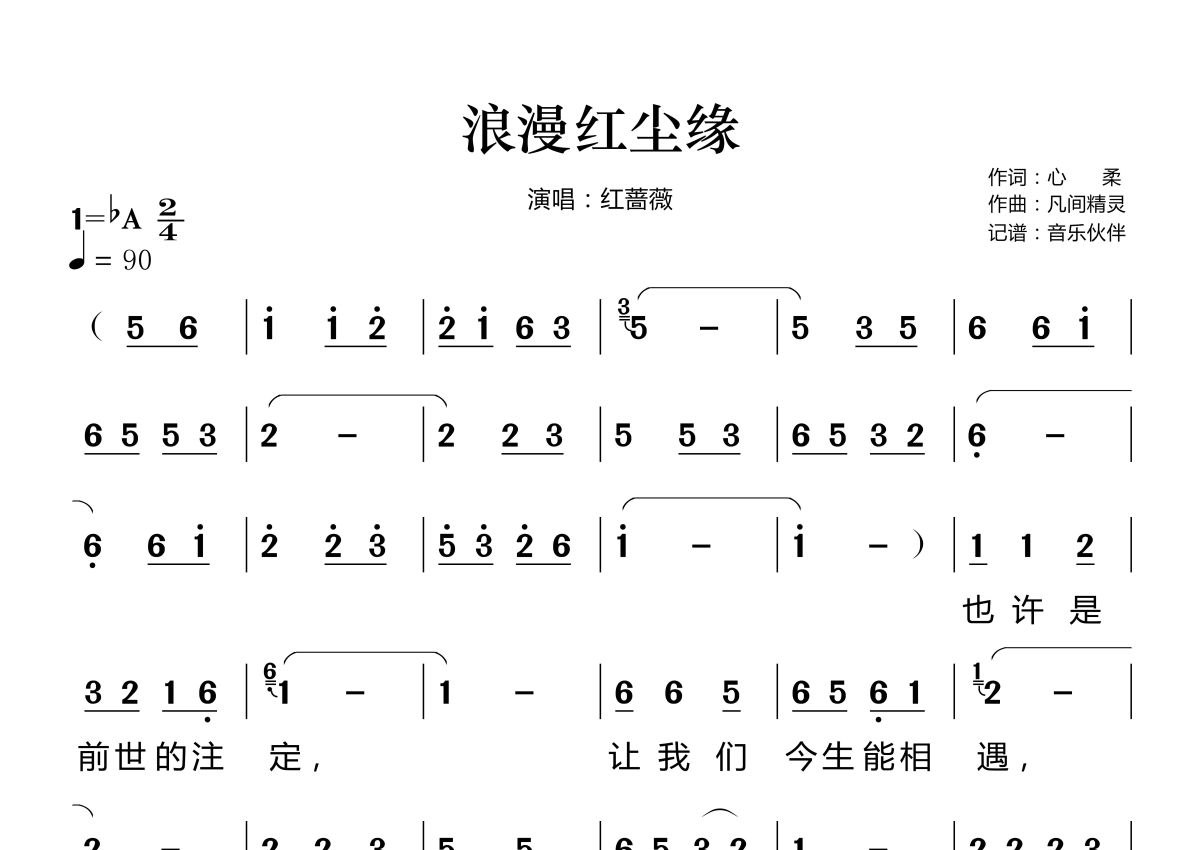 《浪漫红尘缘》是红蔷薇演唱的一首歌曲,拍号为2/4拍,歌曲速度为每分钟90拍,这份简谱共有两张高清图谱,图谱由 @音乐伙伴 编配上传。