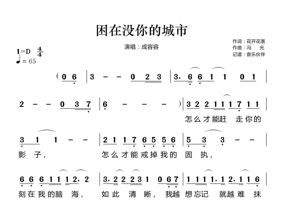 《困在没你的城市》是成容容演唱的一首歌曲,拍号为4/4拍,歌曲速度为每分钟65拍,这份简谱共有两张高清图谱,图谱由 @音乐伙伴 编配上传。