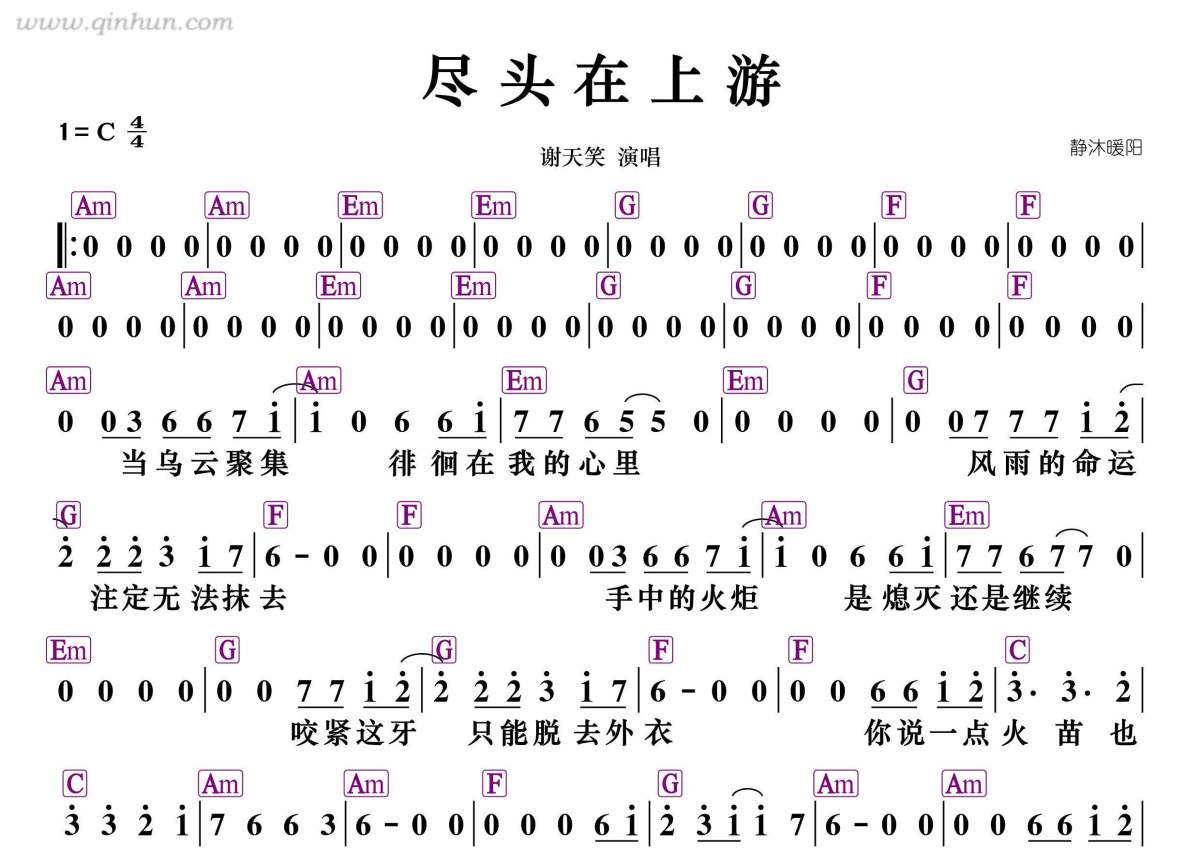 《尽头在上游》是谢天笑演唱的一首歌曲,和弦谱,拍号为4/4拍,这份简谱共有一张高清图谱,图谱由 @静沐暖阳 编配上传。