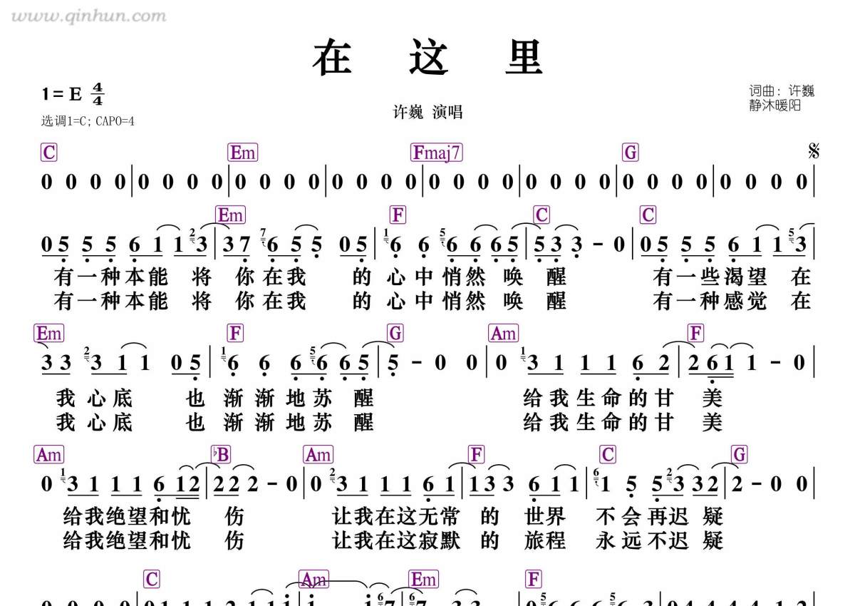 《在这里》是许巍演唱的一首歌曲,和弦谱,拍号为4/4拍,这份简谱共有一张高清图谱,图谱由 @静沐暖阳 编配上传。