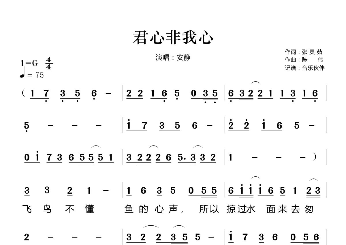 《君心非我心》是安静演唱的一首歌曲,拍号为4/4拍,歌曲速度为每分钟75拍,这份简谱共有两张高清图谱,图谱由 @音乐伙伴 编配上传。