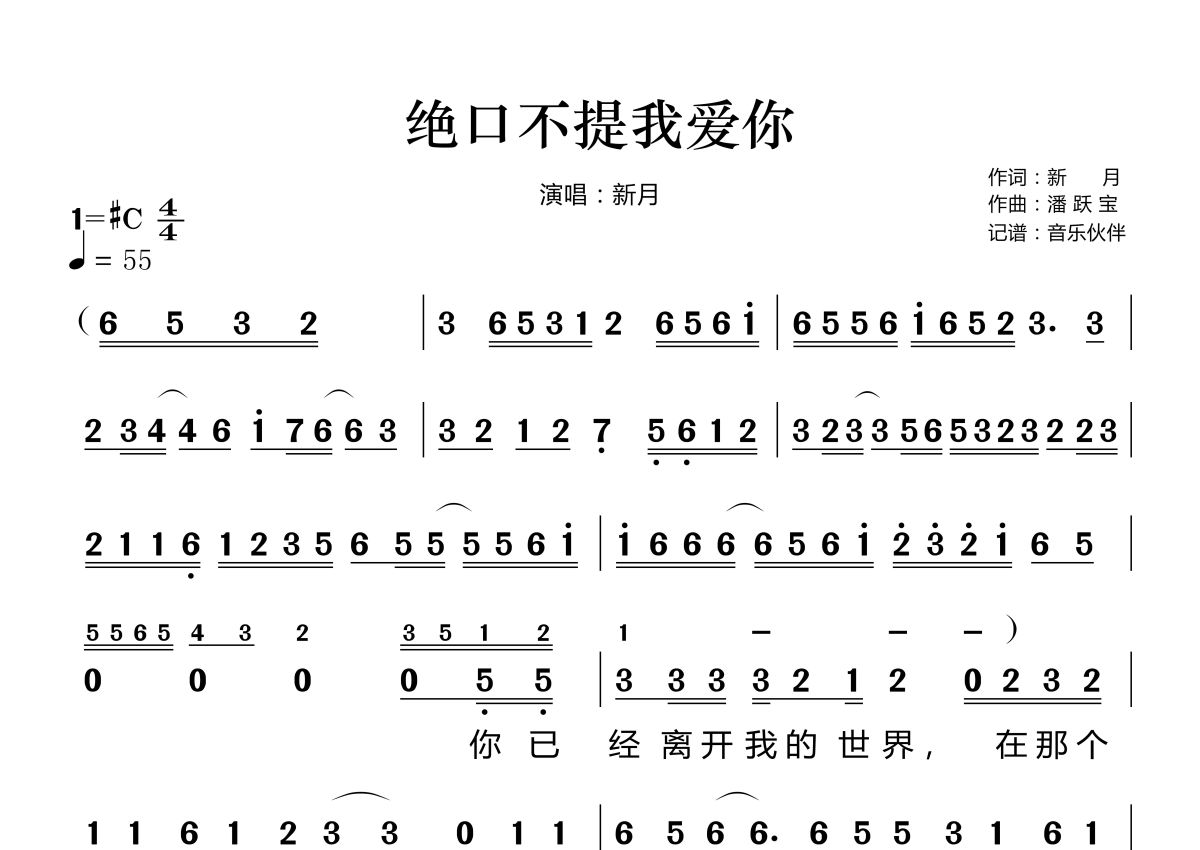 《绝口不提我爱你》是新月演唱的一首歌曲,拍号为4/4拍,歌曲速度为每分钟55拍,这份简谱共有两张高清图谱,图谱由 @音乐伙伴 编配上传。