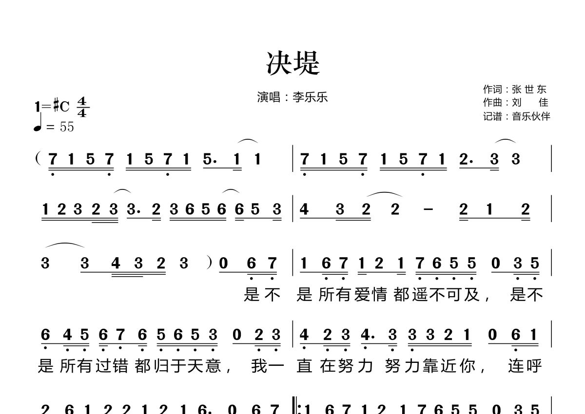 《决堤》是李乐乐演唱的一首歌曲,拍号为4/4拍,歌曲速度为每分钟55拍,这份简谱共有两张高清图谱,图谱由 @音乐伙伴 编配上传。