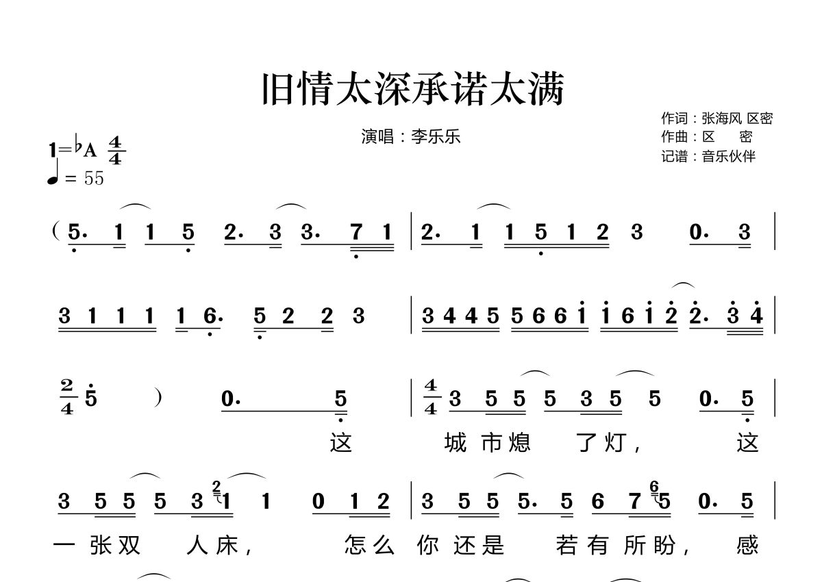 《旧情太深承诺太满》是李乐乐演唱的一首歌曲,拍号为4/4拍,歌曲速度为每分钟55拍,这份简谱共有两张高清图谱,图谱由 @音乐伙伴 编配上传。