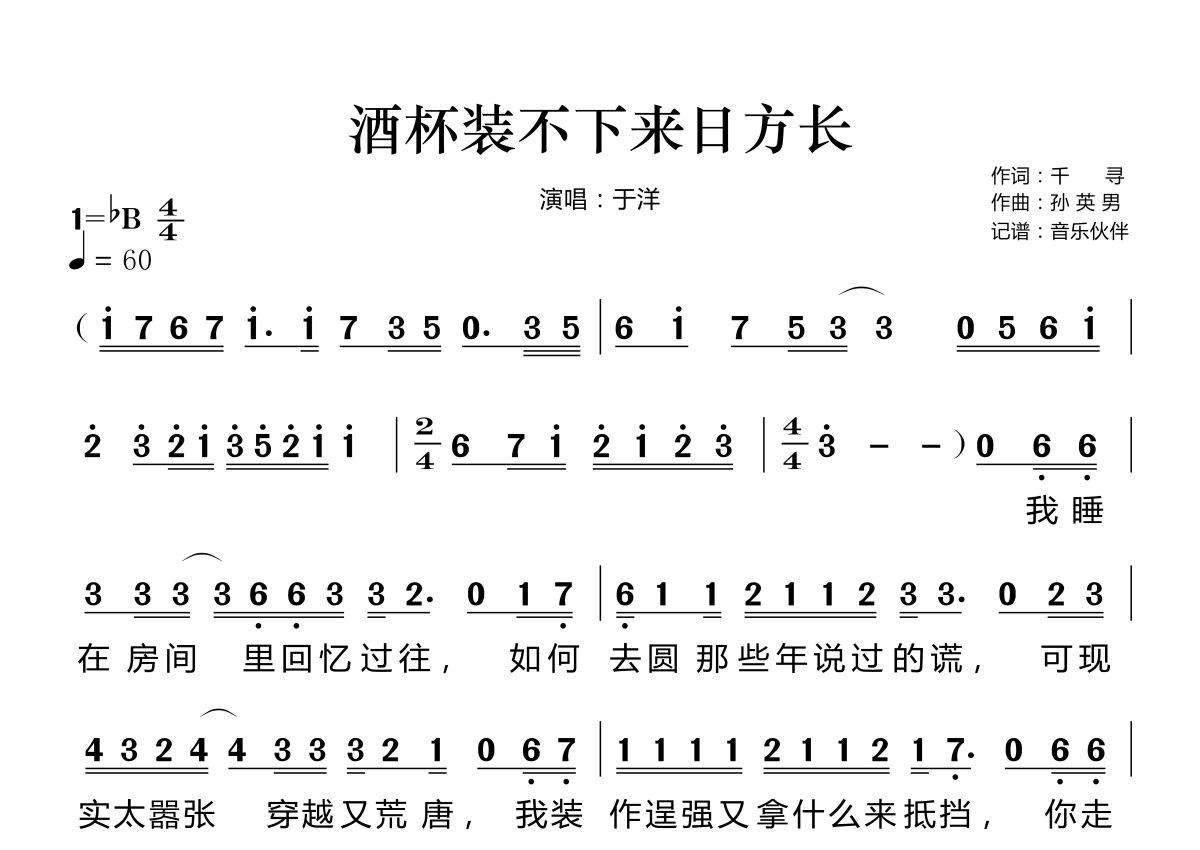《酒杯装不下来日方长》是于洋演唱的一首歌曲,拍号为4/4拍,歌曲速度为每分钟60拍,这份简谱共有两张高清图谱,图谱由 @音乐伙伴 编配上传。