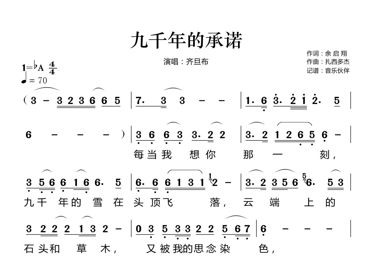 《九千年的承诺》是齐旦布演唱的一首歌曲,拍号为4/4拍,歌曲速度为每分钟70拍,这份简谱共有两张高清图谱,图谱由 @音乐伙伴 编配上传。