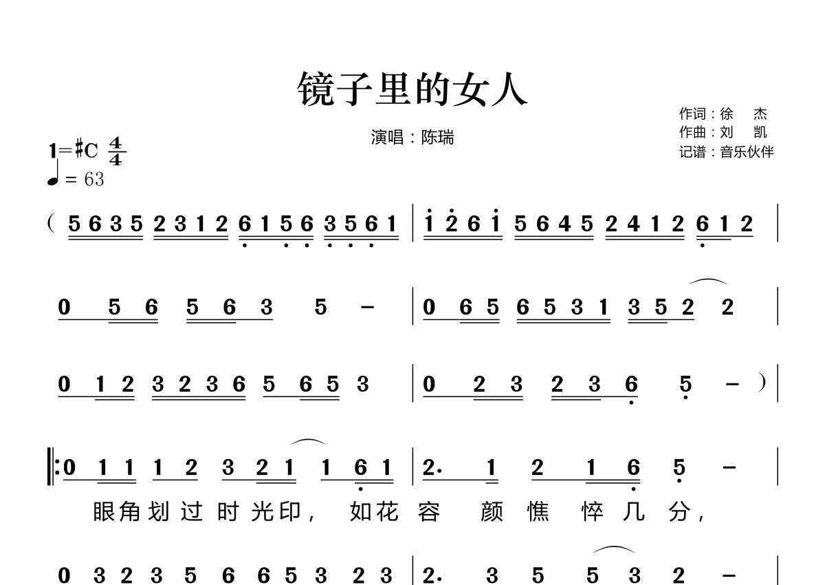 《镜子里的女人》是陈瑞演唱的一首歌曲,拍号为4/4拍,歌曲速度为每分钟63拍,这份简谱共有两张高清图谱,图谱由 @音乐伙伴 编配上传。
