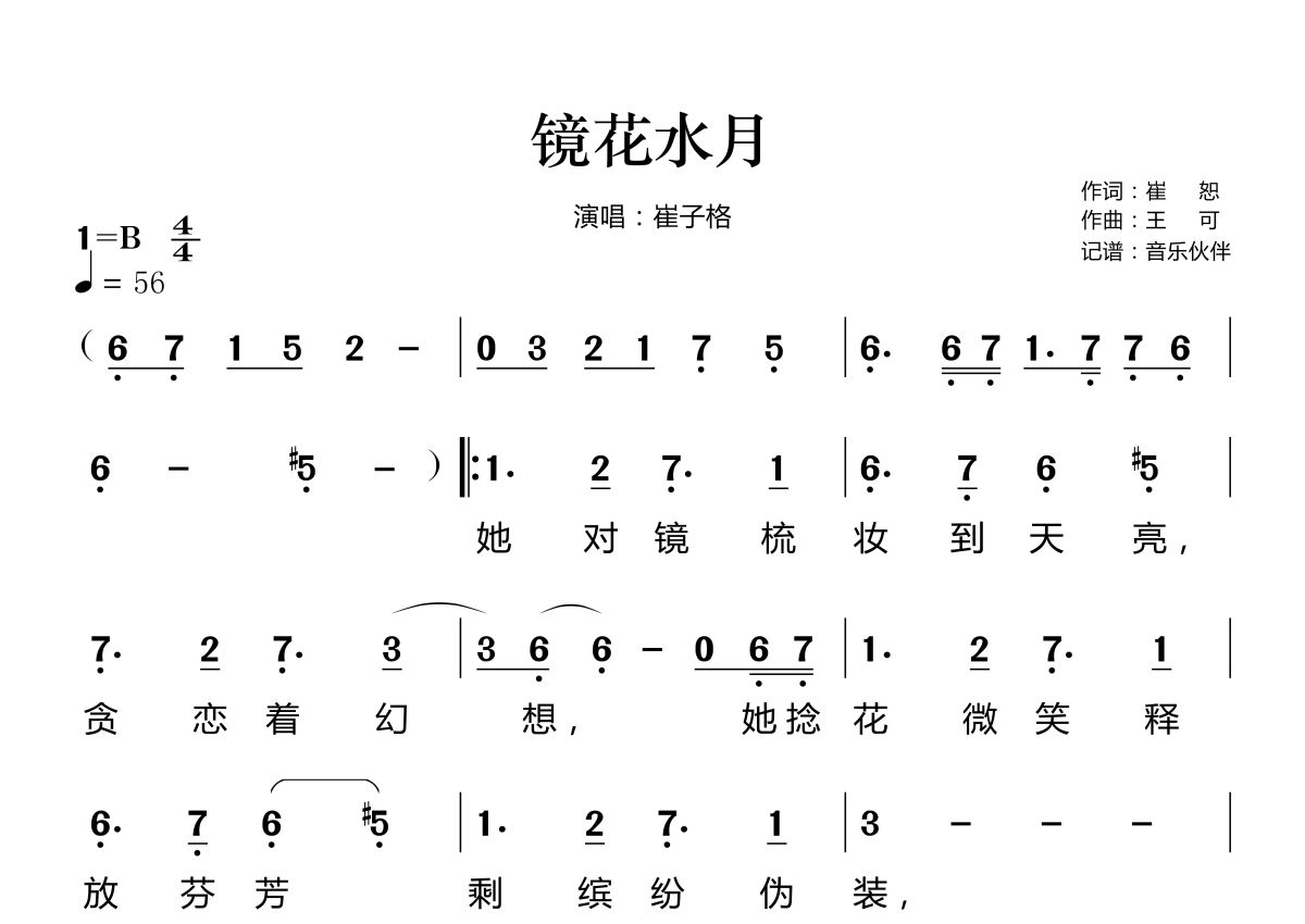 《镜花水月》是崔子格演唱的一首歌曲,拍号为4/4拍,歌曲速度为每分钟56拍,这份简谱共有两张高清图谱,图谱由 @音乐伙伴 编配上传。