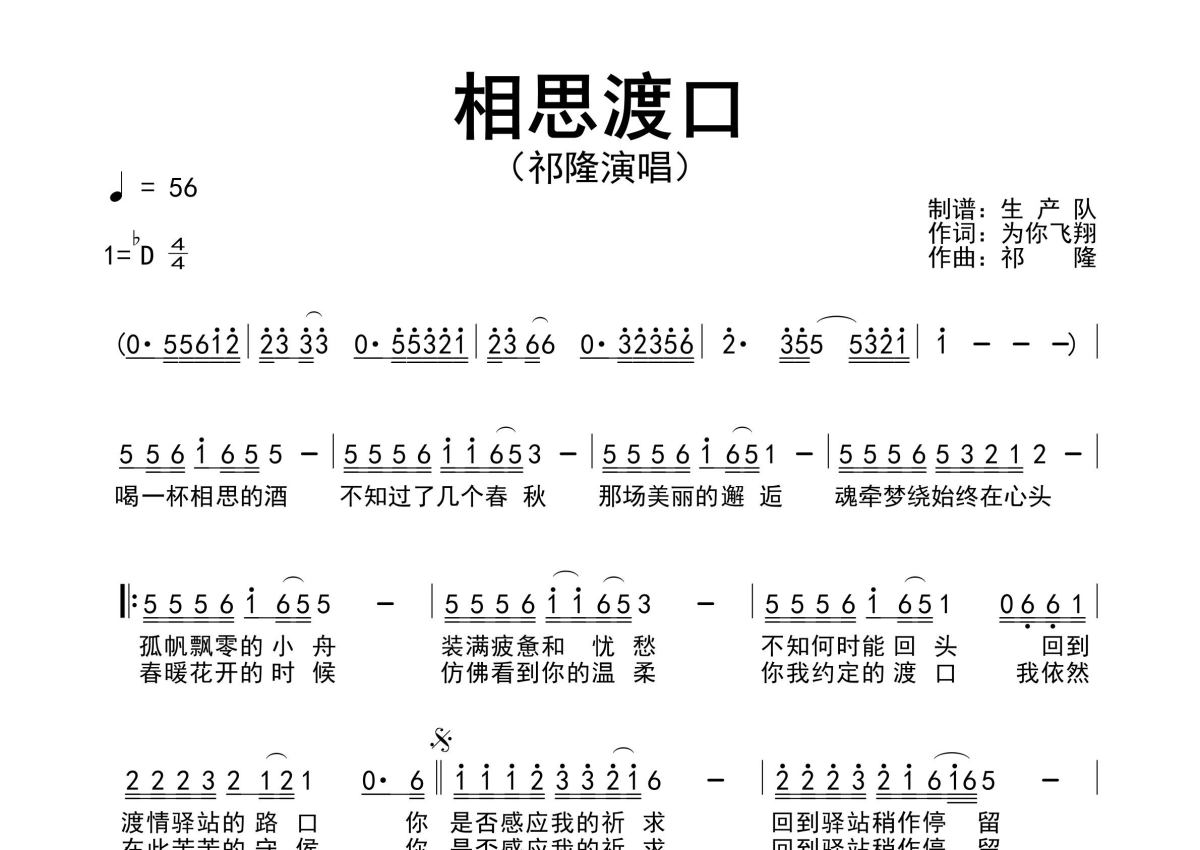 《相思渡口》是祁隆演唱的一首歌曲,原版简谱,拍号为4/4拍,歌曲速度为每分钟56拍,这份简谱共有一张高清图谱,图谱由 @生产队 编配上传祁隆演唱的歌曲《相思渡口》原版简谱,完整的前奏、间奏solo编配。