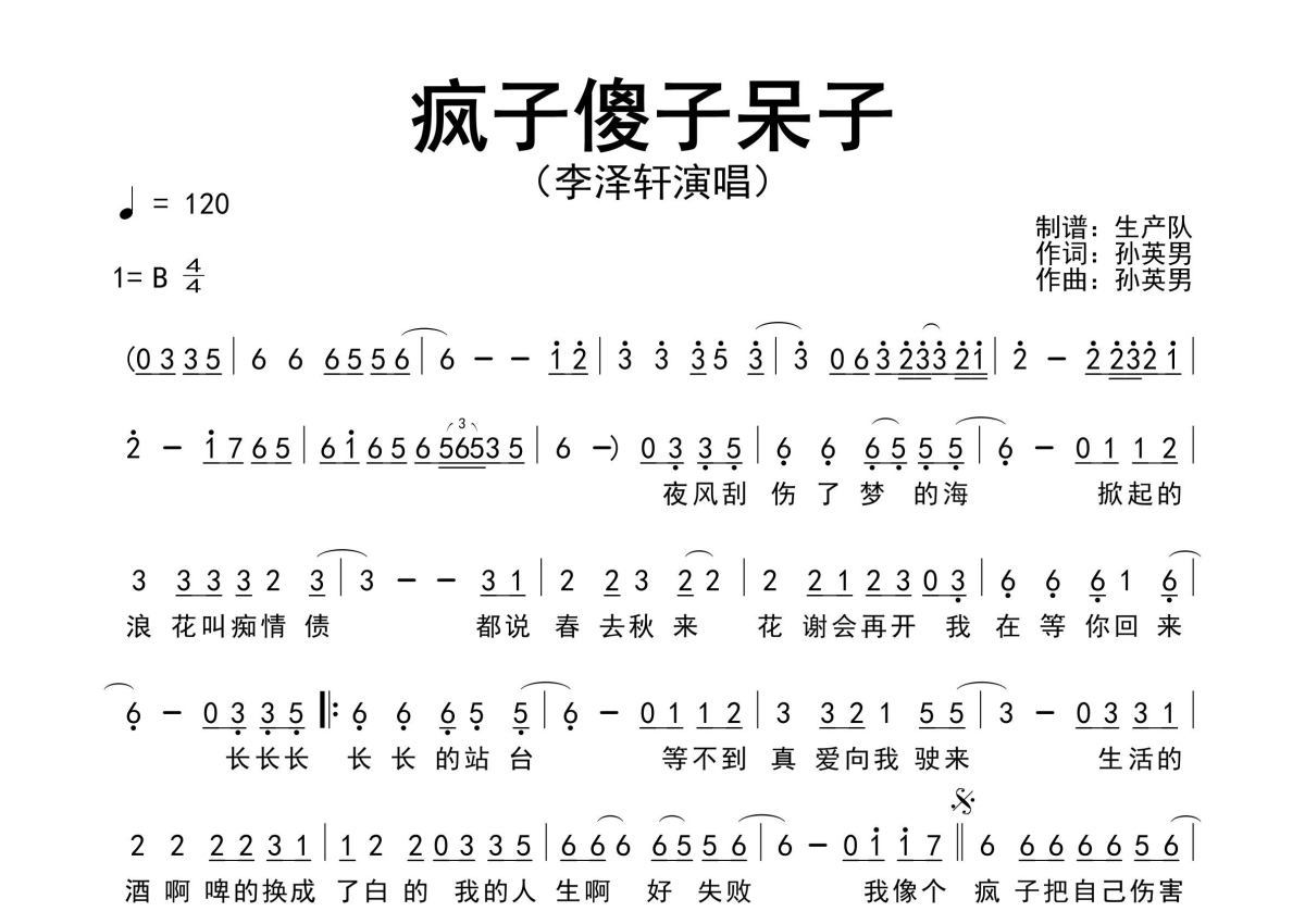 李泽轩《疯子傻子呆子》简谱 - 原版简谱